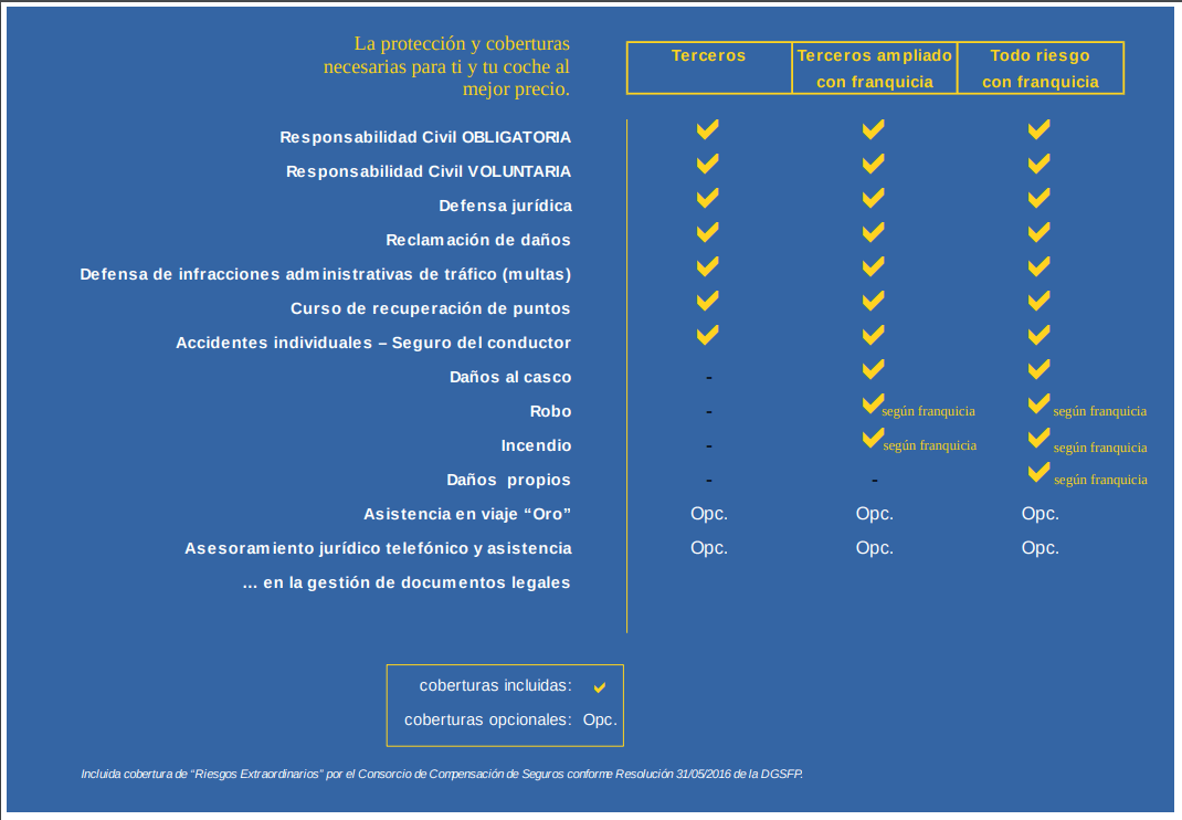 - Robo sin y con franquicia de la motocicleta asegurada (Dependiendo de las condiciones de las distintas compañias aseguradoras elegidas en cada momento)
